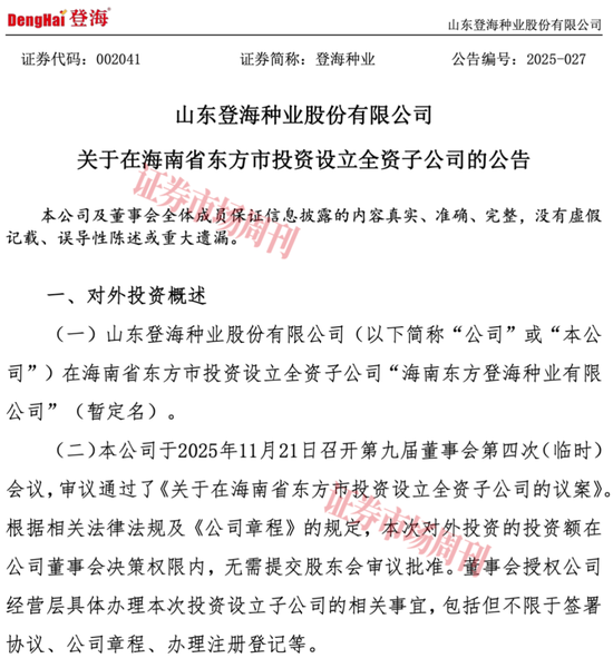 另外,登海种业公告称,拟划拨3000万元在海南省东方市投资设立全资子公司,充分依托海南自贸港独特的自然禀赋和国家战略支持,全面提升公司育种研发创新能力,拓展区域业务布局。
